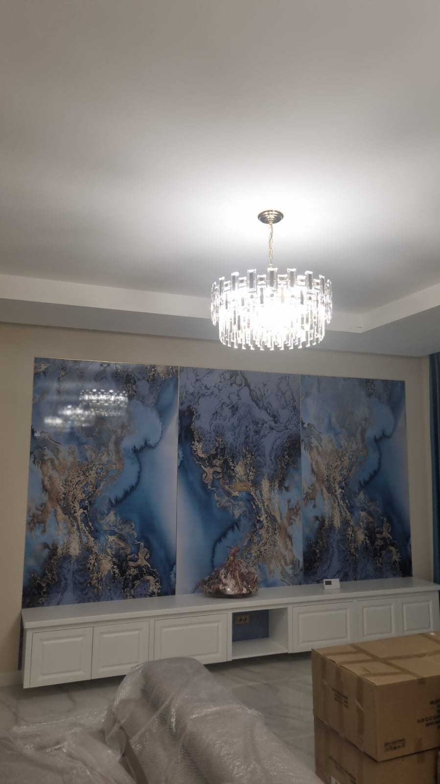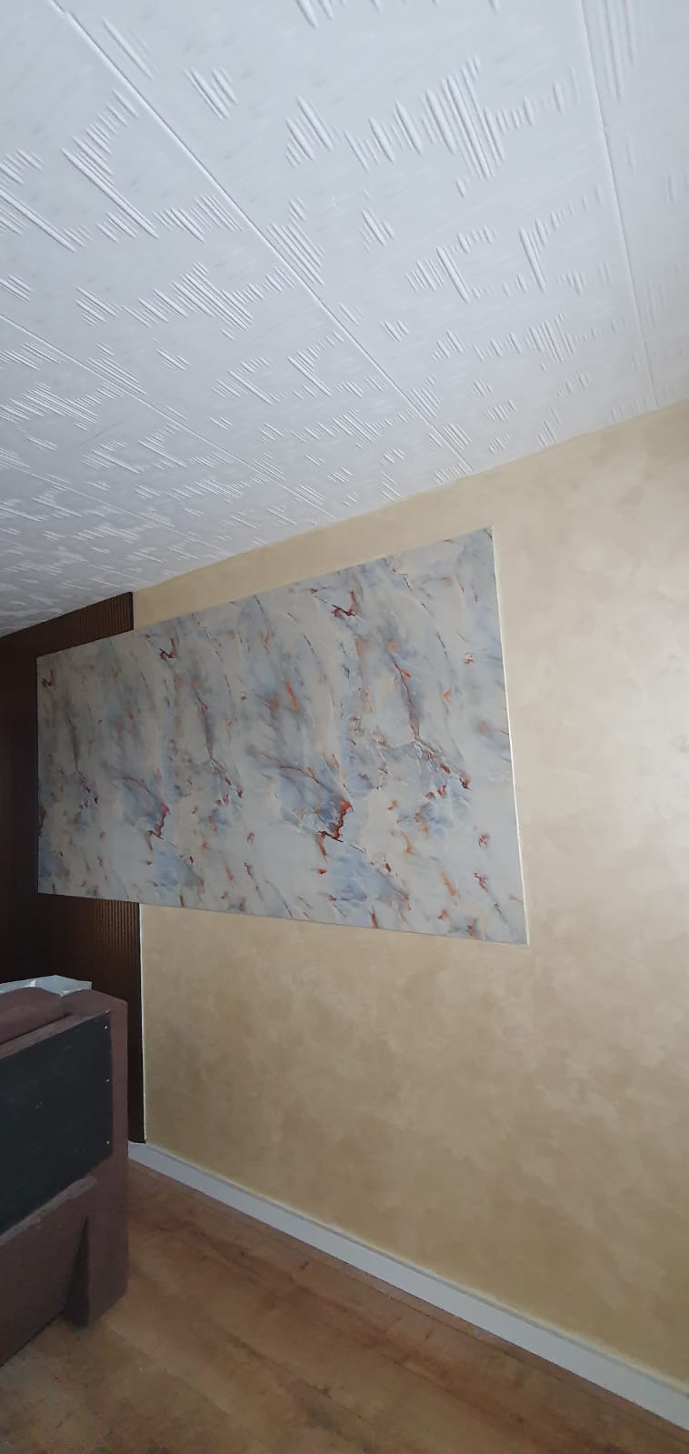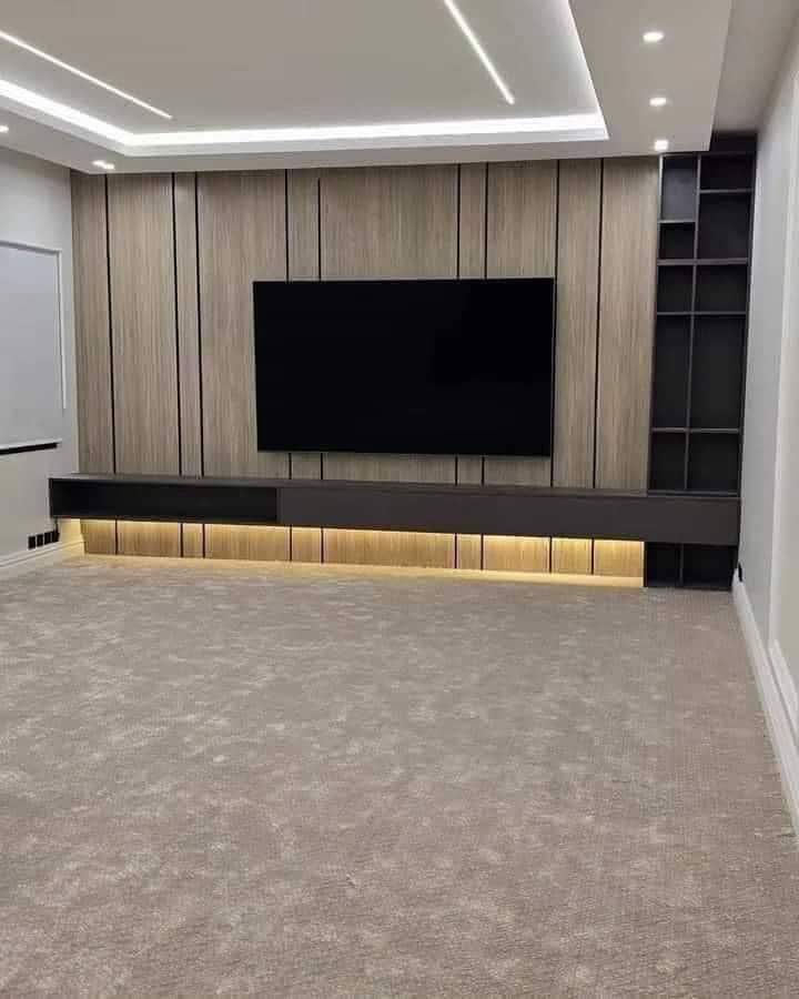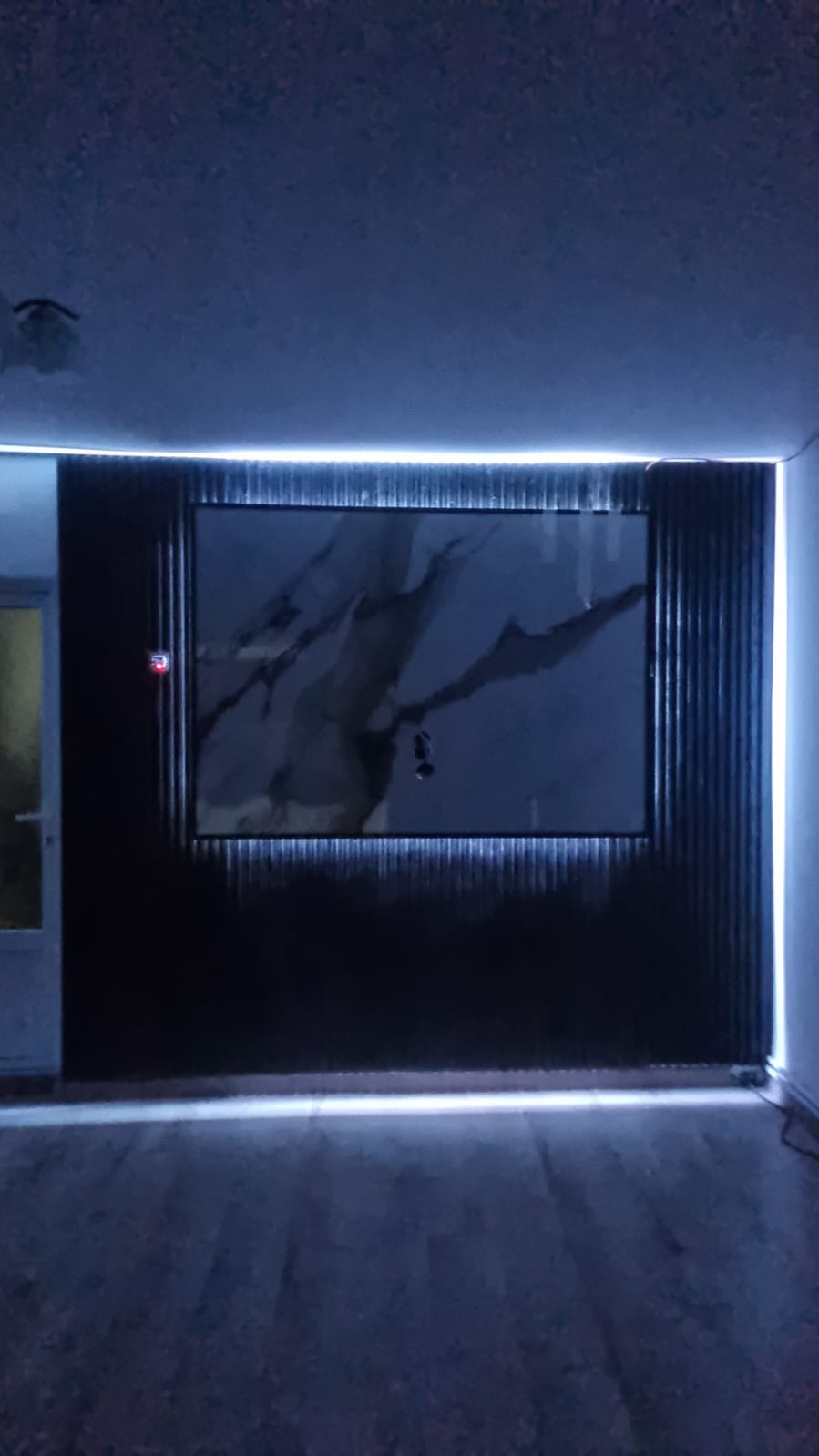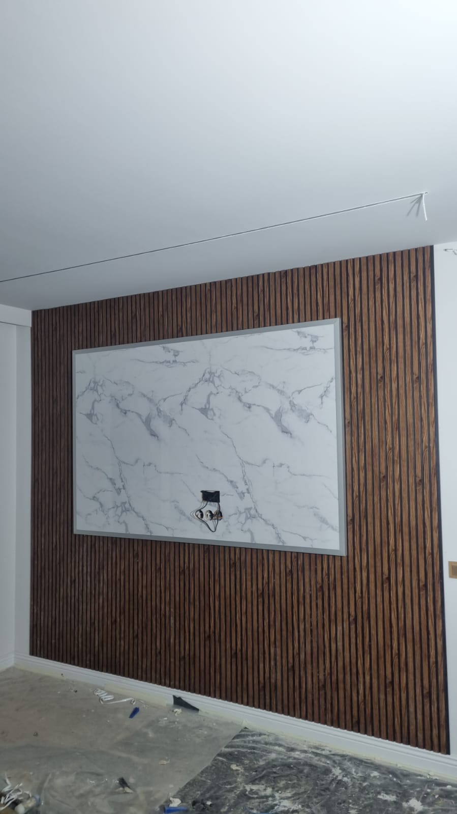 Pereții au fost placați cu panouri decorative moderne, incluzând riflaje și finisaje din marmură sau lemn, pentru un aspect elegant. Montajul profesionist și integrarea benzilor LED au adăugat iluminare ambientală subtilă, transformând spațiul într-un decor contemporan și rafinat.